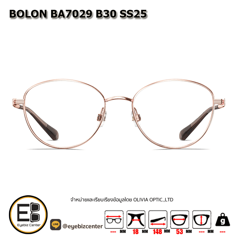 กรอบแว่นสายตา BOLON BA7029 B30 SS25 กรอบแว่นดีไซน์ทรง แคทอาย น้ำหนักเบามาก ไม่เป็นสนิม แข็งแรงสูง ตัวกรอบแว่นด้านหน้าผลิตจากวัสดุ TITANIUM ขาแว่นทำจาก TITANIUM สี ทองชมพู Rosegold ของแท้! มีรับประกัน ส่งเคลมได้ทุกสาขา