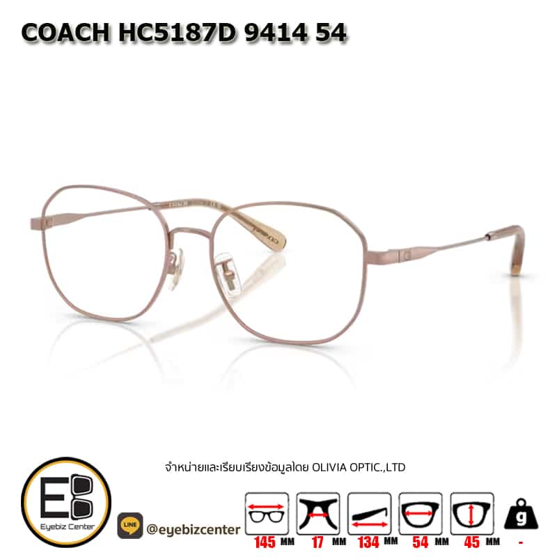 กรอบแว่นสายตา COACH HC5187D 9414 54 กรอบแว่นดีไซน์ทรง เหลี่ยมมน แข็งแรง ทนทาน น้ำหนักเบา สวมใส่สบาย ตัวกรอบแว่นด้านหน้าผลิตจากวัสดุ โลหะ ขาแว่นทำจาก โลหะ สี น้ำตาลอ่อนประกาย ของแท้! มีรับประกัน ส่งเคลมได้ทุกสาขา