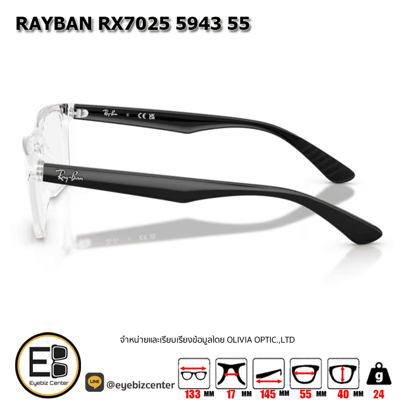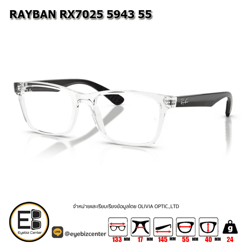กรอบแว่นสายตา RAYBAN RX7025 5943 55 [RBที่ขาแว่น] กรอบแว่นดีไซน์ทรง ไม่ระบุ ตัวกรอบแว่นด้านหน้าผลิตจากวัสดุ INJECTED ขาแว่นทำจาก INJECTED สี TRANSPARENT & BLACK ของแท้! มีรับประกัน ส่งเคลมได้ทุกสาขา