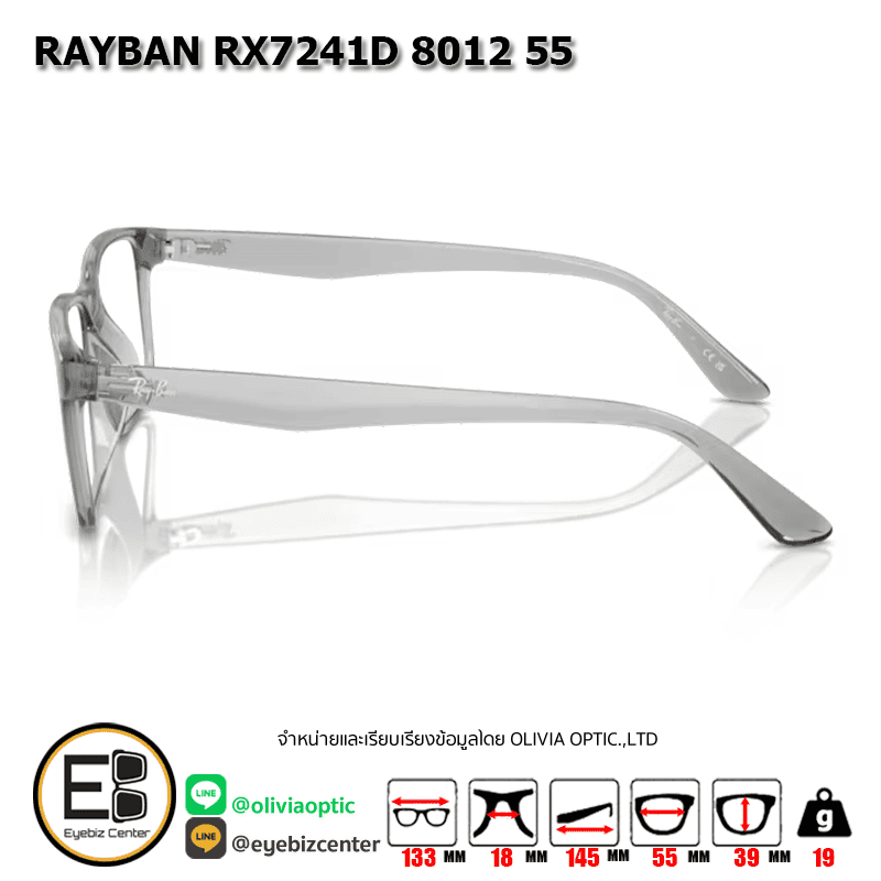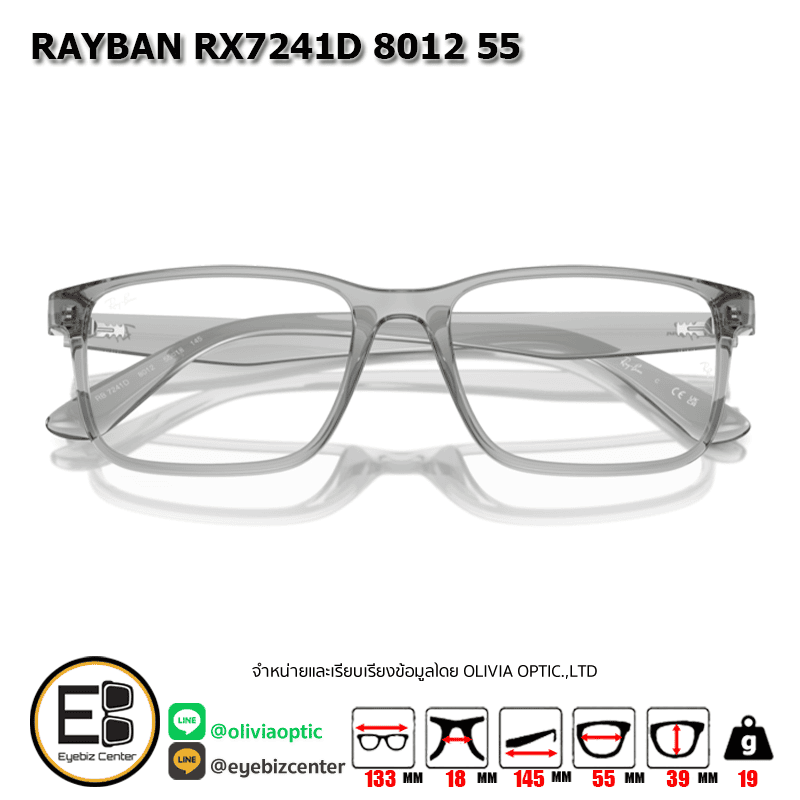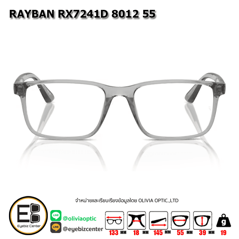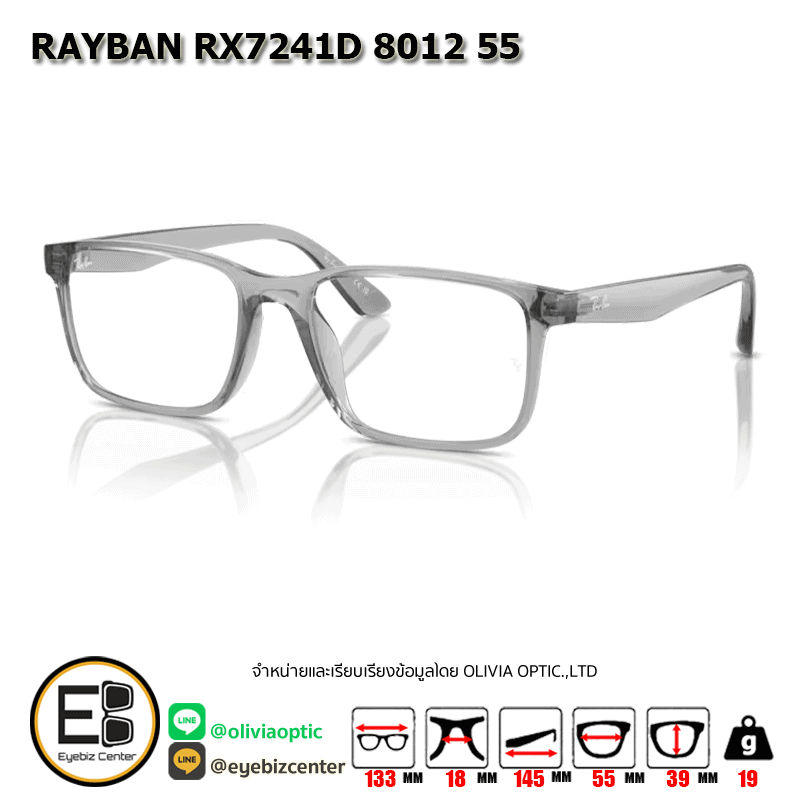 กรอบแว่นสายตา RAYBAN RX7241D 8012 55 [RBที่ขาแว่น] กรอบแว่นดีไซน์ทรง ไม่ระบุ ตัวกรอบแว่นด้านหน้าผลิตจากวัสดุ INJECTED ขาแว่นทำจาก INJECTED สี TRANSPARENT GREY ของแท้! มีรับประกัน ส่งเคลมได้ทุกสาขา